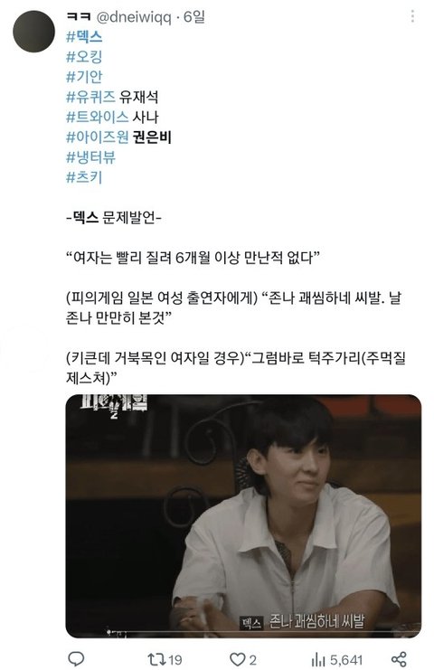 1은 팩트인데 저렇게 말하진 않았음 그냥 "6개월 이상 연애 해본 적이 없다" 이렇게만 말했을 걸? 근데 솔직히 나도 연애를 길게 하질 못해서 공감가서 그런가 딱히 문제인지 모르겠음... 그렇다고 해서 바람둥이도 아니고 그냥 연애 자체를 그래서 많이 안 하더라 그리고 2번도 팩트임 그때도 잘못이다 아니다 의견이 갈리긴 했는데 상황 설명을 하자면 그 일본여자(후지이 미나)가 너무 착하고 자기 의견 피력을 못하다가 결국 자기 팀에서 몰이 당해서 결국 탈락자 후보까지 돼버렸고 상대편인 덱스팀은 다들 미나를 좀 안타까워 하고 있었어(홍진호 피셜) 근데 미나가 대뜸 데스매치 상대로 덱스를 찍어버린 거임... 본인을 몰아간 자기 팀들을 찍는 게 아니라 아니라 오히려 아무 상관 없고 미나를 동정하고 있었던 덱스를 찍어버리니까 덱스는 순간 자기가 미나를 동정했던 것도 바보된 것 같고 뭔가 배신감 비슷한 게 들어서 괘씸하다고 표현한 것 같음ㅋㅋ 근데 미나 입장을 생각하면 미나도 덱스를 찍을 수밖에 없었어.. 왜냐면 아무리 분해도 그래도 그 팀에서 계속 생존하려면 그 팀을 찍을 순 없었던 거임. 그래서 개인적으로는 미나도 덱스도 양쪽 다 이해는 감. 하지만 덱스가 너무 예상치 못하게 지목 당해서 욱한 나머지 말을 심하게 했긴 해... 까놓고 말해서 덱스가 원래 순한 편이 아니고 당시 서바이벌을 며칠째 찍고 있어서 정신이 피폐하기도 했고 또 피디 인터뷰를 봐도 비속어 많이 쓰고 최대한 리얼하게 하라고 주문했어서 출연진들 상당수가 말이 많이 거칠긴 해. 여튼 덱스 말이 왜 저렇게 거치냐고 한다면 뭐... 솔직히 덱스 원래 저런 듯 ㅋㅋ 여자한텐 저렇게 안 하긴 하는데 그렇다고 말하는 게 순하진 않아 그건 팩트임 그리고 3번은 내가 저 장면을 못 봐서 모름... 근데 개빡센 UDT에서 4년 구르고 갓 전역해서 방송활동 할 때는 진짜 거칠었어 ㅋㅋ 지금은 본인이 "그땐 갓 전역해서 사회화가 너무 안 돼있었다"라고 말을 많이 하고 이젠 남자한테든 여자한테든 저런 말을 안 하긴 하는데 그래도 저 때 저 발언만 놓고 보면 깰 수 있긴 함 여튼 1번은 저렇게 말하지도 않았을 뿐더러 연애 길게 못하는 게 잘못인지 모르겠고 2번 3번은 뭐 그걸 잘못이라 생각한다고 해도 누가 뭐라할 순 없을 듯... 나도 그냥 저 트윗에 저렇게만 띡 적혀있으니 설명을 적은 거지만 그래도 잘못이라 생각한다면 뭐 생각 차이니까 존중해