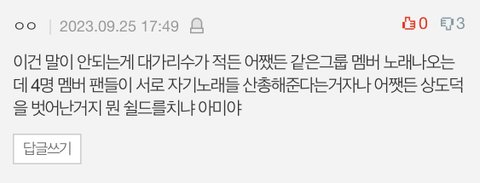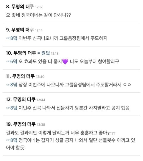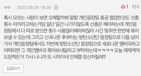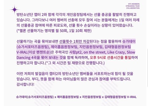 아래짤 보면 알겠지만 저런 이유인거고 정국음정팀쪽은 정국이 노래가 곧 나올 거 예상하고 당분간 선총도 아끼는중이라 조심스러웠던거고 이미 먼저 노래 나온 멤버들 개인음정팀에서 선총에 효과적이게 같이 독려하자고 조율중이였는데 정국이 싱글이 일요일날 갑자기 발표된 상황인거ㅇㅇ 이걸로 방탄팬이나 정국 개인팬도 아닌것들이 이간질하는거 멈춰라 개인 음정팀은 같은 시간에 4곡을 선총해도 한번으로 횟수 차감되는거라 협력할뿐이지 저녁 선총 한번으로 화력을 만들어서 누구만 어쩌고 할만한게 못됨!