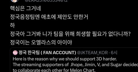 아니 총공시간 겹쳐서 태형음정팀이랑 윤기음정팀이 협업하기로 한거고 좋은 아이디어 같아서 지민 호비 음정팀이 먼저 연락한거 아님? 몰랐으면 저렇게 오해소지 다분한 글을 올려도 되냐 지들이 나중에라도 연락하든가 왜 쟤네한테 먼저 연락해야하는건데? 외퀴들한테 오히려 견제롤 못 박는거 같음 개싸움나겠네 ㅅㅂ