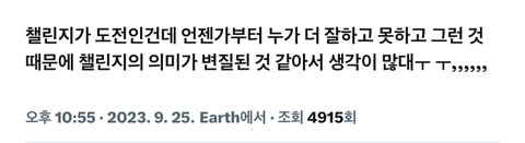 솔직히 나도 속으로 계속 생각했었지만 좋은 의미로 시작한 챌린지가 왜 이런 식으로 변질되어야 하는지 모르겠다 진짜 도전을 한다는 의미가 아닌 누군가가 평가를 하고 비판을 하는 의미가 되었다는 게 너무 속상함