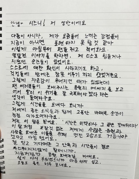 사진은 성찬이가 직접 써준 손편지 (라이즈 데뷔 전)