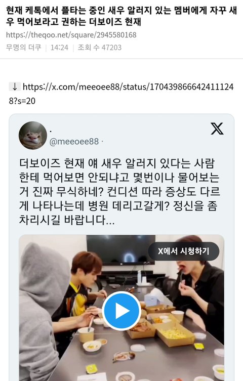이걸 쉴드치네 제이콥이 새우를 계속 잘 먹든 알러지가 있다는게 논점인데 계속 먹으라고 하는게 권하는거임? 강요겠지 상대방이 싫다고 거부하는데 계속 질문형 하는건 권하는게 아닌 강요란다 알고 말하렴 알러지가 다시 올라왔다는것도 애초에 있었다는거잖아 그리고 친하다는건 핑계고 쉴드야 논점 모름? 이게 친하고 안 친하고의 문제인가 알러지 있는 사람한테 음식 먹으라고 하는게 문제야 쉴드 치니까 남돌이 욕먹지 알러지가 얼마나 위험한데;;