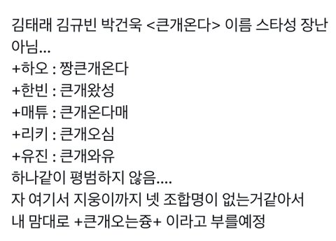 콩딱즈랑 행운즈? 이거 한유진이랑 장하오 조합명 이거 예쁘던데 궁금해서 더 찾아보니까 석박지 왜팀 태건브이 태맄태맄체인지 ㅈㄴ 다양하게 있던데ㅋㅋㅋㅋㅋㅌㅌ