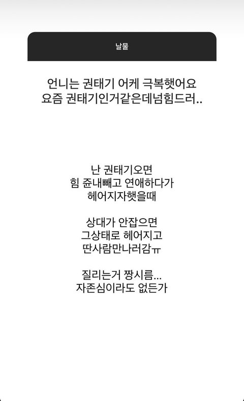 전남친도 인스타던데 전에올렸던 스토리랑 판글들 훑어보니까 질리면 다른사람만나러 간다고 말하는거보니 왜 헤어졌는지 딱 짐작가네...