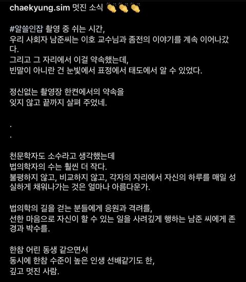 같이 알쓸인잡 촬영하신 심채경 박사님이 인스타에 올리신 글인데 도움의 손길이 필요한 곳에 적재적소로 기부를 하는 걸 볼때면 나도 저런 멋진 사람이 되어야지 하게 됨