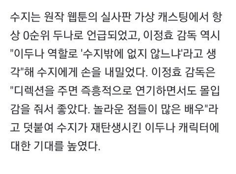 이두나 웹툰 원작부터 작가가 대놓고 수지보고 쓴거 같은게 수지 떠오르는 장면이 너무 많아서 그냥 이두나 하면 수지임