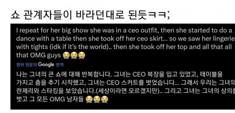 스트립쇼 짤 보니까 중요부위 보여주고 ㄲㅈ같은; 물론 가리긴 했지만 수위도 높고 음지문화를 양지에 끌고 오는데 당연 욕먹지 지수나 제니가 저렇게 중요부위 보여줬어봐 성희롱 365일 내내 남초에서 당할걸? 물론 보여주진 않았지만 안보여줘도 제니 지수면 어땠겠냐 그리고 베댓뭐임? 스트립쇼랑 담배랑 같냐? 남돌이 중요부위 보여주는 쇼하면 그건그거대로 토나오고 욕먹을걸 딴 것도 아니고 이걸 쉴드치냐