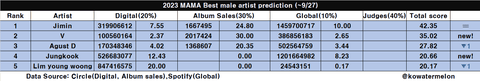 마마 남자 솔로가수상 - 지민 유력