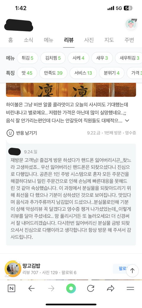 이 상황을 설명하려 다시 가게에 갔습니다당황하시길래 "아까 확신하지 않으셨냐? 그분이 가져간게 맞았다"라고 하니 본인은 손님들이 더 중요하고 아까 너무 바빠서 그랬다 등등 변명만 하시네요..말이 안통해서 끊고 리뷰를 남기기 위해 영수증이나 달라고 했습니다그랬더니 "그럼 말걸지 마세요" 라고 정색을 하네요 ...