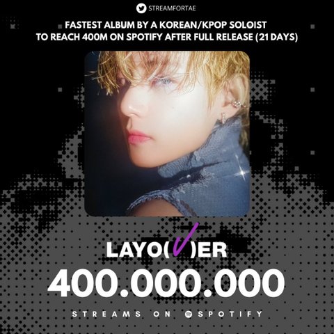 뷔 요번 앨범 명반임 뷔의 레이오버는 스포티파이에서 가장 빠른 속도로 4억 스트리밍을 달성한 한국 kpop 솔로이스트의 앨범 자랑스러워