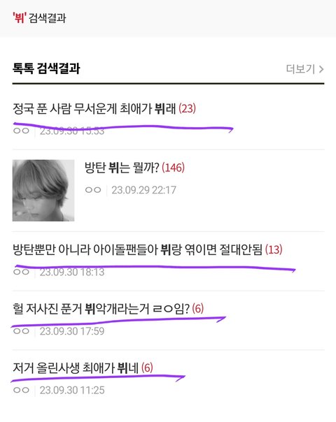 대놓고 제목에 정국이라고 적어놓고 뷔랑 이간질하는데 팬이 대놓고 새끼 이름으로 어그로를 끌겠냐고 ㅅㅂ 이딴 파생글 쓰면서 또 정국뷔 이간질 글 톡선왔는데 쉴드는 다른데가서 하라고 조롱하고 억까하는게 정상임? 진짜 다들 그만좀해라