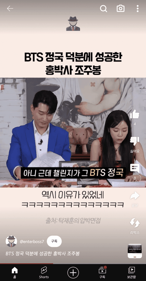 정국이 개다리 춤을 추길했냐 19금 가사부분 노래하길 했냐 뭔 챌린지 e지랄 그냥 홍박사님을 아세요? 이 한소절 언급하고 요즘 유툽에 알아서 뭐가 많이 뜬다 그러고 지나갔는데 챌린지 했다고 우기고 자빠졌네