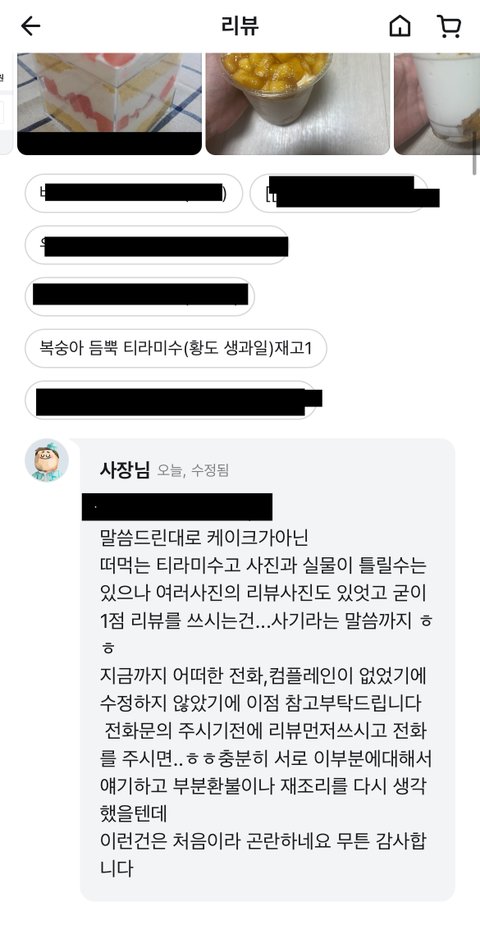 리뷰작성을 하였고 제 리뷰에 달린 사장님 댓글이