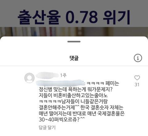 댓글 남들 진짜 핀트를 못잡네. 본문은 국결을 빌미로 여자 후려치는 남자의 무례함을 꼬집고 있는거임. 출산율 올리고 싶고 아쉬운 입장이면 협상 상대에게 최소한의 동등한 대접과 존중은 보여야 하는건데 남자들은 여잘 협상 상대로 보지도 않음. 언제까지나 후려쳐서 여자 머리채잡고 흔들 생각만 하는데 여자 눈에 남자가 인생 중대사 결혼 하자고 논의할 상대로 보이겠음?
