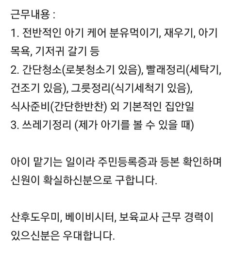 당근보다가 아기돌보기 사람구한다고 되어있던데 시급 1만원 이던데 아기뿐아니라 집안잡일까지 하는게 맞는건가요?