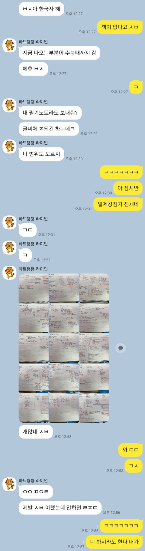 내가 내일 한국사 시험인데 교과서 없다했더니 자기 필기노트 다 찍어서 보내줌.. ㄹㅇ 쩐다..