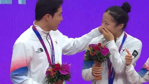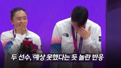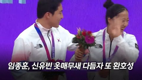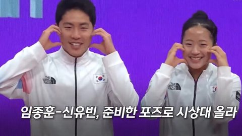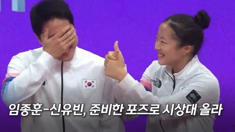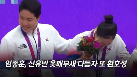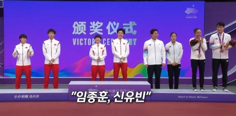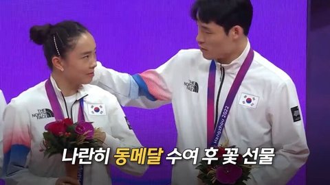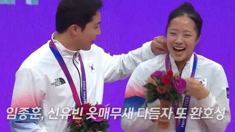 메달 수여 받고 임종훈이 신유빈의 옷매무새를 다듬어주니까
