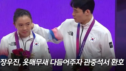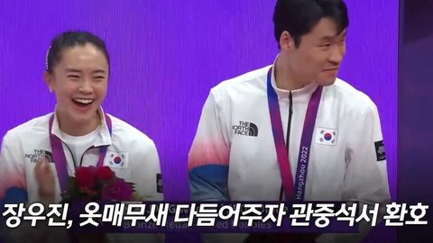 장우진 선수가 전지희 선수의 옷매무새를 다듬어주자