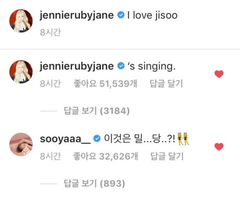 제니가 캡션엔 I love jisoo 라고 썼다가 뭔가 부끄러웠는지 댓글창에 's singing. 을 덧붙임ㅋㅋㅋㅋㅋㅋㅋ 그걸 본 지수는 ''이것은 밀당..?!'' 이라고 댓글 닮ㅋㅋㅋㅋㅋㅋ