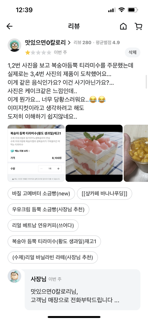 하다못해 통이라도 똑같은걸 쓰던가.. 다이소 20개에 천원하는통에다 생크림잔뜩붓고 언제 썰었는지도 모르는 갈변된 복숭아 몇개 올려놓고 똑같은거라고 우기는게.... 저래팔면 엄청 돈남겠네