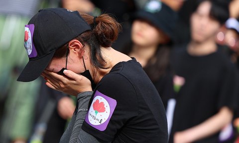 (사진6 설명) 서울 서이초등학교 교사의 49재 추모일인 4일 서울 여의도 국회 앞에서 열린 추모 집회에서 한 참가자가 헌화하며 오열하고 있다. 연합뉴스