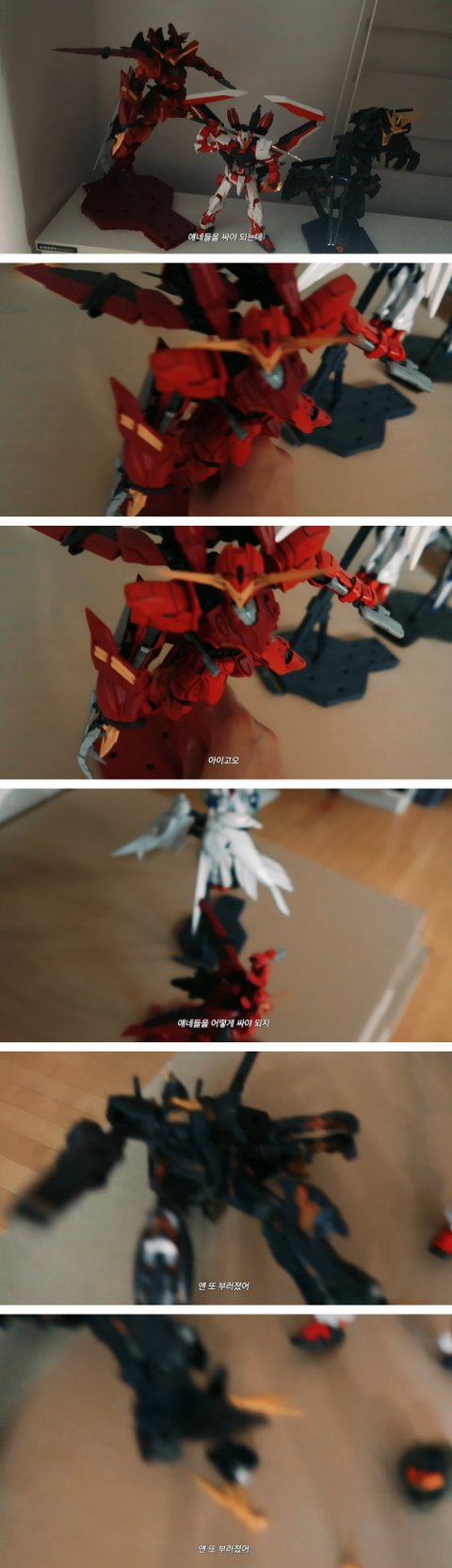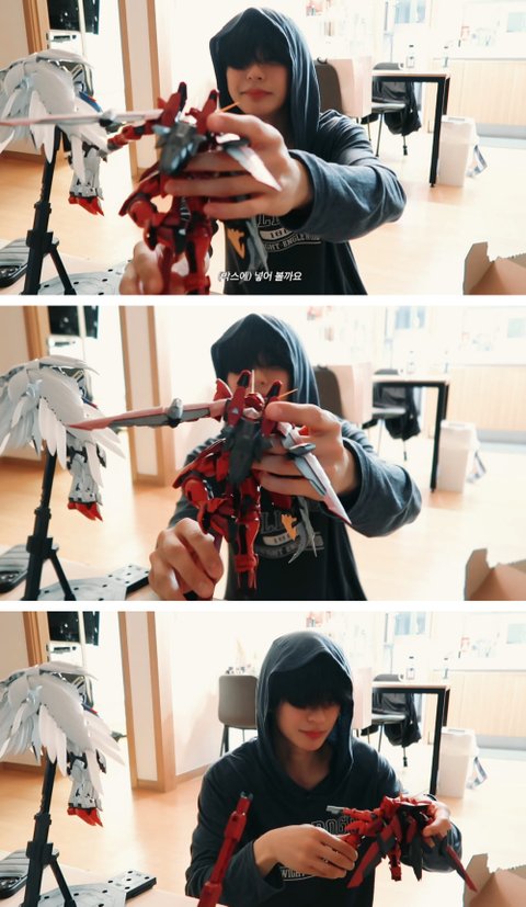 챙기다 파츠가 부러진 건담 발견... 덤덤하게 부러졌다고 말함..