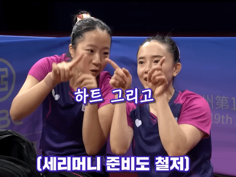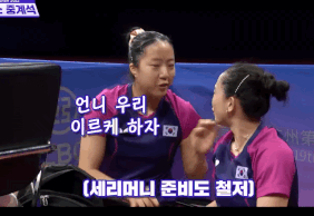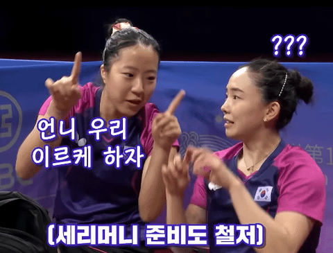 신유빈이 전지희에게 세리머니를 알려주는데..