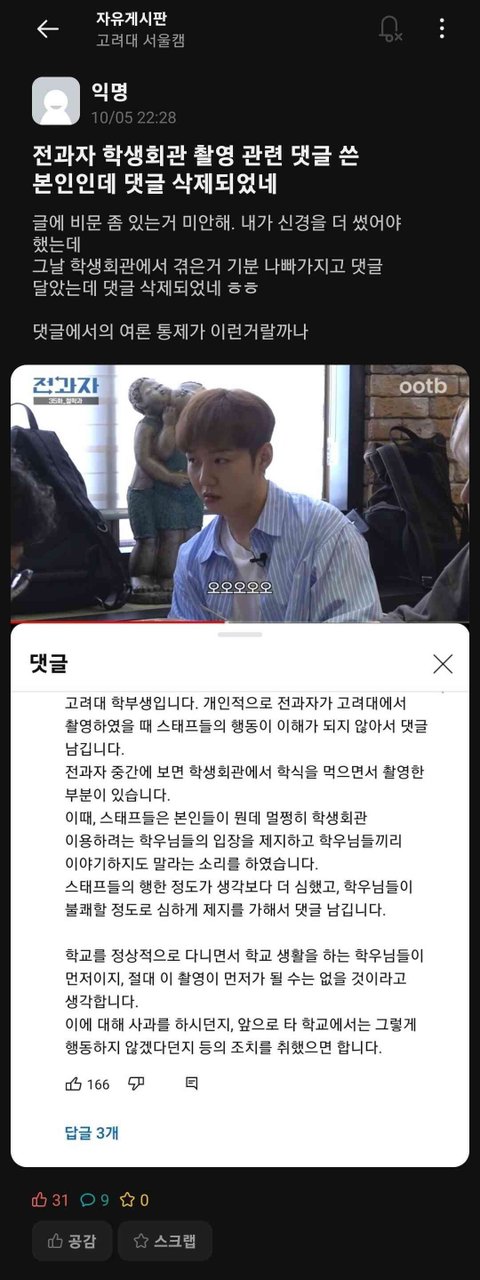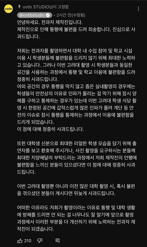오오티비 측에선 고려대 철학과편 댓글로 사과문 올림