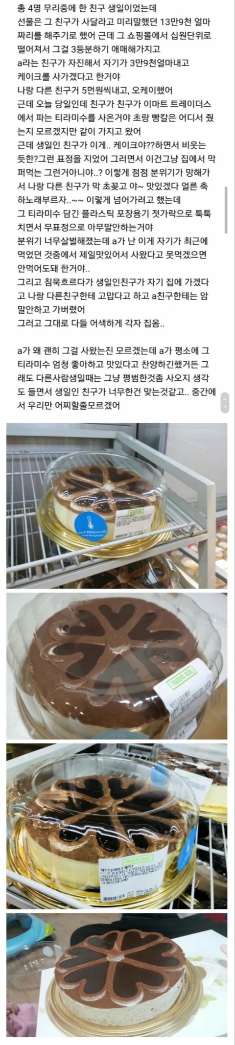 웃긴게 선물 십삼만 얼마에다 케잌값까지 해서 엔빵하면 되는데 왜 선물값만 엔빵하냐? 그럼 a친구가 삼만 구천원 냈으면 당연 만천원 짜리 케잌 살거라 생각 안한건가? 그 친구가 특별히 더 돈 내고 좋은 케잌으로 사 오길 바란거야? 물론 나라면 제대로 된 케잌으로 샀겠지만 손해봤다는 생각은 들거 같은데 그 친구는 손해보긴 싫었나보지 애초에 케잌까지 준비하려고 했으면 케잌값까지 합쳐 엔빵해야지 웃긴 애들이다 전부