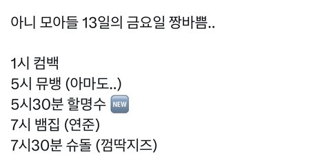 스케쥴은 다 알고 있었는데 전부 다 13일인건 처음 알았어 스밍하기도 바쁜데 떡밥까지 쓰러지겠다ㅋㅋㅋㅋㅋ(좋다는뜻)