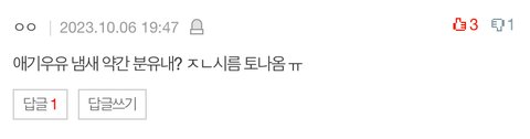 그런 냄새 난다고 들은 사람 글에 그냥 싫다고만 하든가 토나온다 하는건 어디서 배워먹은 예의임 사회성 ㅈㄴ 없어보여 개싫다 현살에서 안만나고싶음