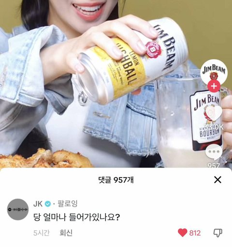 정국: 당 얼마나 들어가있나요? 짐빔: 전정국 귀엽당 전정국 사랑한당 전정국 보고싶당... 주접 실화냐고ㅋㅋㅋㅋㅋㅋㅋ