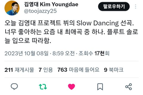 요즘 최애곡중의 하나가 뷔의 슬로우 댄싱이래 플루트 부분도 따라하신대ㅋㅋㅋ근데 슬댄 진짜 좋고 럽미어겐도 좋음