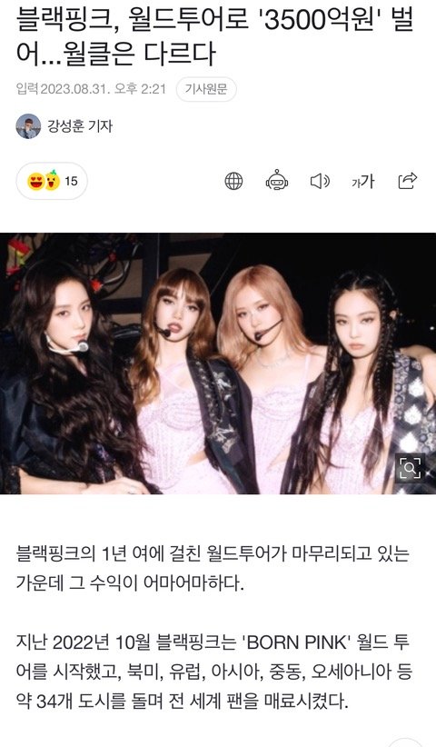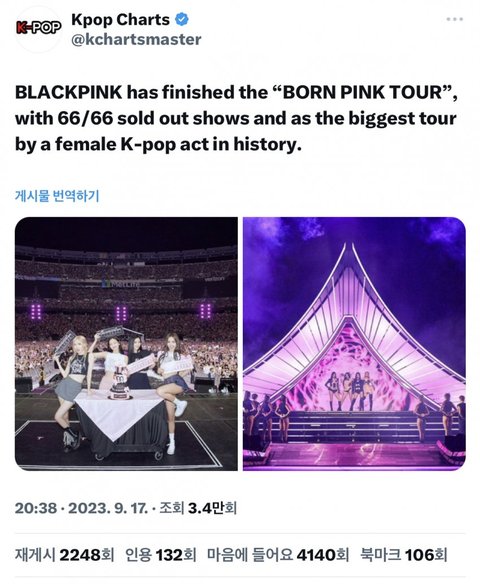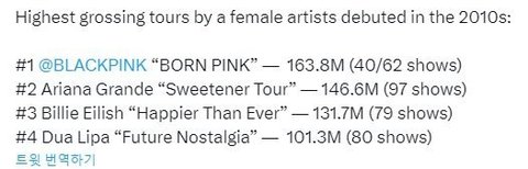 블핑이 전세계 여가수중에 투어 매출도 제일 높다고함...