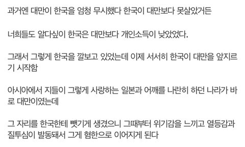 대만이 예전에 한국보다 잘나갔는데 이제 한국이 더 잘나가서 열등감으로 싫어한다고함 동남아랑 똑같음