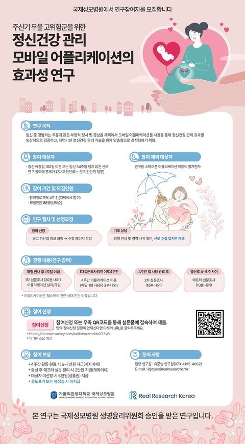 가톨릭 관동대학교 국제성모병원에서 진행하는 ‘주산기 우울 고위험군을 위한 정신건강 관리 모바일 애플리케이션의 효과성’을 알아보고자 연구참여자를 모집하고 있습니다.