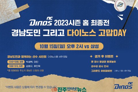 또한 이날 경기 후에는 팬 감사 영상과 불꽃놀이, 선수단 감사 인사, 그라운드 하이파이브(다이노스앱 사전 모집) 등 이벤트도 준비된다.