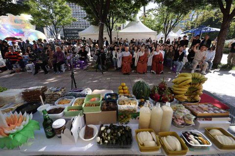 (사진3 설명) 희생자 추모 합동 차례 참석자들이 추석인 지난달 29일 오후 서울광장에 마련된 10·29 이태원 참사 희생자 합동분향소에서 이태원 참사 특별법 제정을 촉구하는 구호를 외치고 있다. (사진=연합뉴스 제공)