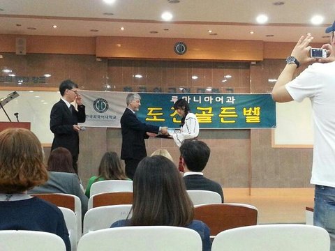(사진7~8 설명) 한국 주재 루마니아 대사께서 우리 딸(루마니아어과 1학년)에게 해외연수 장학증서를 수여하는 모습.