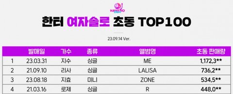여자 솔로 초동 1위