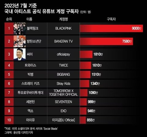 유튜브 구독자수 전세계 아티스트 1위