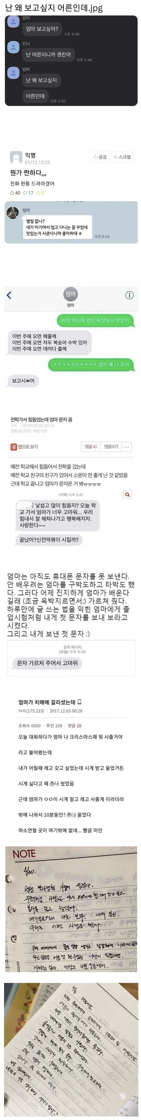 나는 엄마가 살아계신데, 울 엄마는 차갑고 냉정한 분이라 저런 따뜻한 정을 한 번도 못느껴봤음. 그렇다고 딱히 학대를 한 건 아니고 의무적 경제적 뒷바라지는 해주셨지만, 다들 말하는 엄마 이미지 - 푸근하고 의지하고 싶고 늘 내 편인 - 이런 건 정말 1도 없음. 엄마 입장에서는 엄마 자식이 엄마 본인, 혹은 지인들의 자식보다 영 부족해서 마땅치 않으셨던 듯. 가끔은 그리워할 존재로서의 엄마가 없다는 게 아쉬움. 내게 엄마는 그냥 차가운 회사 상사 같은 분이니까. 욕먹겠지만, 난 지금 당장 엄마가 돌아가셔도 별로 슬프지 않을 것 같다.