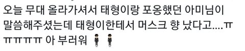 오늘 뷔 팬미팅 뷔크닉했거든 마지막에 아미들한테 가까이 와서 사진찍었는데 후기가 이거임 미친거 아닌가? 하트랑 알티 폭발함 아미들 반응 미쳤음 ㅅㅂ 나도 괴롭다