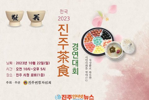 진주연합차인회(회장 이동수)는 오는 10월 22일(일) 10시 진주시청 로비(1층)에서 r각 지역특산물 이용한 차식들이 경합을 펼치는 ‘전국 2023 진주차식 경연대회‘ 행사를 개최한다. 이날 행사에는 차식 및 차 생활도구 전시, 나눔 차회 및 차 생활 홍보 부스도 운영된다.
