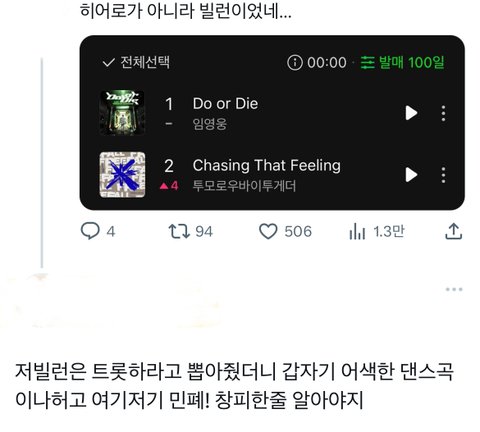 영웅님 노래가 좋아서, 듣는사람들이 많아서 순위권에 있는건데 질투와 시기로 욕하는게 참 안쓰럽고