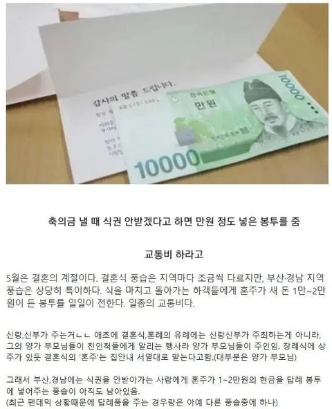 이거 결혼식뿐만 아니라 장례식에도 있습니다. 같은 지역 아닌 멀리서 오신 조문객들껜 차비 넣어 드렸습니다.