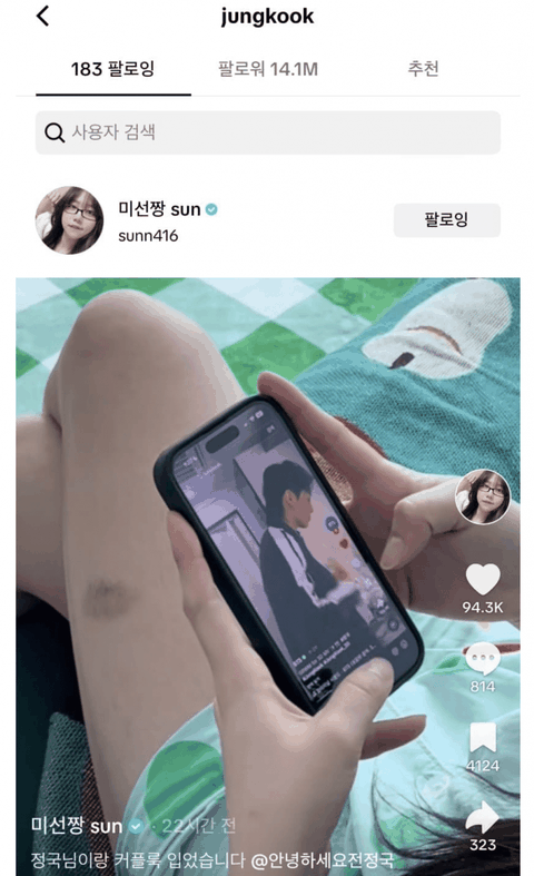 방탄 정국 미선짱 틱톡 팔로했네
