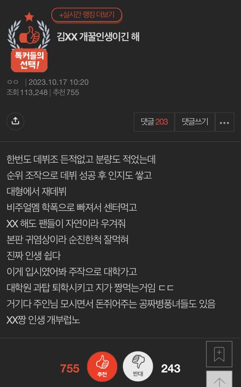 여기서 한초원 이가은한테나 관심주라면서 은근히 성적으로 내려치는 애들이 더 역겨움 ㅋㅋㅋ 애초에 피해자라서 방송의 수혜를 못얻었으니 당연히 성적 못낼수밖에 없지 그게 커뮤에서 관심 가져준다고 해결될 일임? 대중한테 알릴 수 있는 기회를 억울하게 놓쳐서 그렇게 된건데 진짜 역겨운 논리 펼치네.