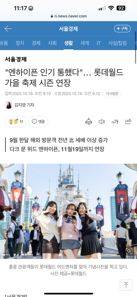 엔하이픈 다크문 롯데월드 연장한다함 11월19일까지 연장한데 엔하이픈땜에 롯월 해외방문객 전년도보다 3배이상 올랐다고함 엔하이픈 인기 많아졌으~~ 아주좋아
