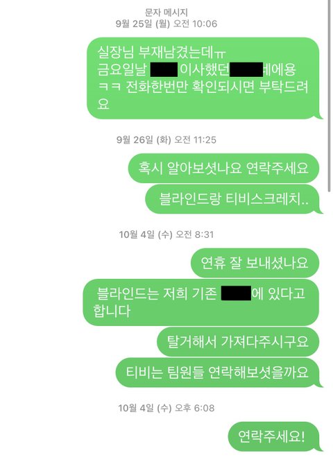 몸살이나서 팀원들만,,, 그 날 일을 했다 하더라구요! 자세한 내용을 팀원들에게 듣고 연락 준다길래 기다렸고 또 연락이 없어서 제가 다음 날 연락했죠,, 어떻게 확인되셨냐,, 그리고 저희집에 블라인드도 하나 탈거 안해 오셨더라구요ㅜㅜ 그래서 그것도 부탁한다 했더니 알겠다 확인하고 블라인드 전 집 가서 탈거해오겠다 라고 하시더니 연락 또 없으시고 그러다 보니 명절 연휴가 시작됬는데 제가,, 또 명절에 실장님도 가족들이랑 시간 다들 보내고 있을테니까,,